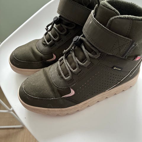 Viking barnesko i størrelse 39, unisex. Skoene har høyt skaft med snøring og borrelås øverst for bedre tilpasning rundt ankelen. Overdelen er i grønn tekstil/imitert skinn med polstret kant og pløse for økt komfort. Yttersålen er i gummi med grovt mønster for godt grep på underlaget. Passer til hverdagsbruk for barn og ungdom.