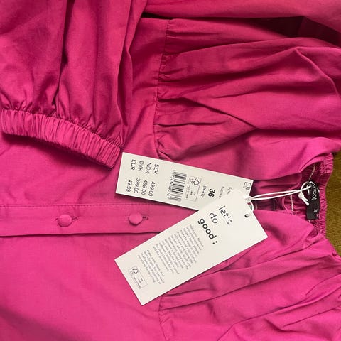 Kjolen er rosa. Modellen har trekvart lange ermer, drapering i front og glidelås i ryggen. Stoffet har en myk, lett skinnende overflate. Passer som penkjole til ulike anledninger. Vask- og vedlikeholdsinformasjon står på innsiden av plagget.
