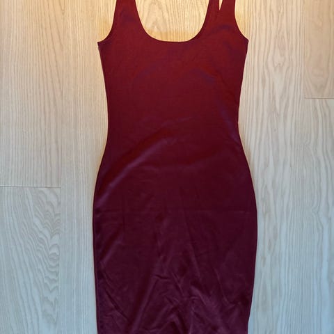 Gina Tricot hverdagskjole for dame i størrelse S. Kjolen er burgunder farget og laget av 35% bomull og 65% polyester. En enkel, ermeløs hverdagskjole som passer til daglig bruk og kan kombineres med ulike plagg og tilbehør etter sesong.