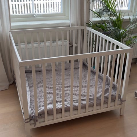 Sengen er utformet som en åpen sidevognseng som kan plasseres inntil voksenseng. Den har spiler rundt og buet kortside, samt flat bunn til madrass. På bildene følger det med festereimer og festeplate for å kunne sikre sengen til voksensengen. Egner seg for spedbarn i den første perioden, der man ønsker barnet nært sengen til foreldrene. Materiale fremstår som malt treverk.