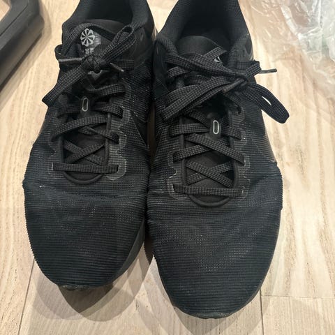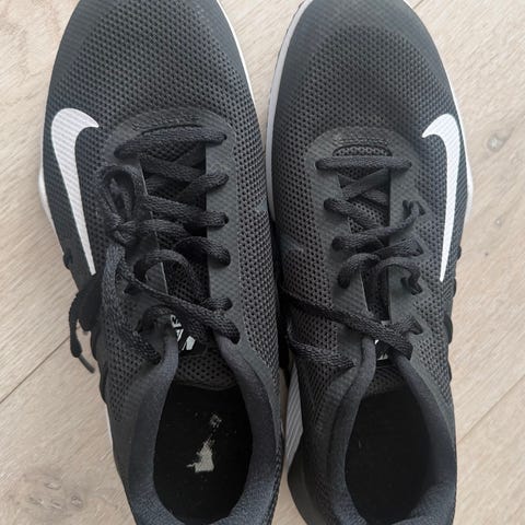 Nike løpesko i størrelse 41. Skoene er svarte med blå Nike-logo og hvit mellomsåle. Overdelen er i tekstil/mesh med snøring foran. Yttersålen har gummimønster for grep ved løping. Egnet til løping og annen trening utendørs eller innendørs.