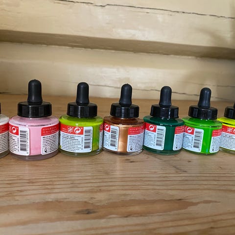 Sett med akrylmaling i flere farger. Inneholder flere bokser og tuber med maling i ulike nyanser, blant annet blå, sølv, grønn, turkis, brun, svart, grønn, gul og rød. Egnet til bruk på lerret, papir eller andre egnede overflater for akrylmaling. Mengde per boks og tube varierer etter produsentens standardstørrelser. Fargene leveres i plastbokser med skrulokk og tuber med skrukork.