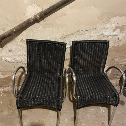To hagestoler i grå kunstrotting. Stolene har buet rygg og armlener i samme materiale, med flettet sete og rygg. Egnet til bruk utendørs på terrasse, balkong eller i hage. Selges samlet som sett på to stoler.