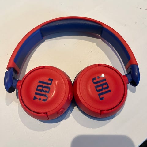 JBL trådløse hodetelefoner i rød og blå farge til barn. On-ear modell med polstrede øreputer og justerbar hodebøyle. Lades via USB-C-port på ørekoppen. Egnet for bruk med kompatible enheter som støtter trådløs lydtilkobling.