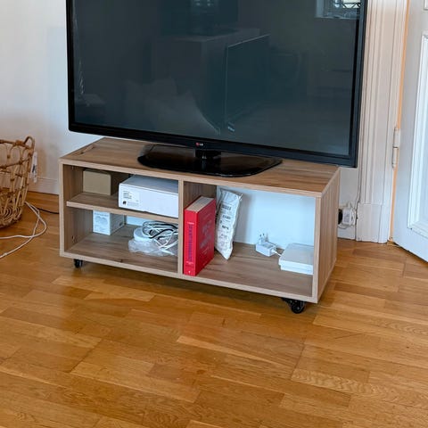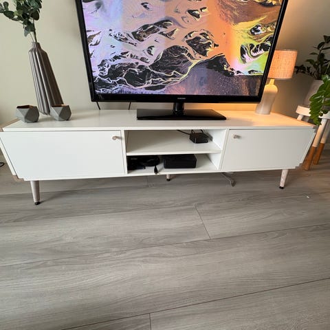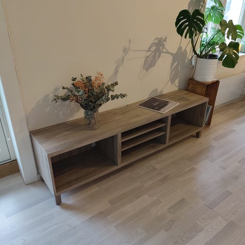 God plass til TV, dekoder og annet utstyr. Åpen hylleløsning gir enkel tilgang til elektronikk.