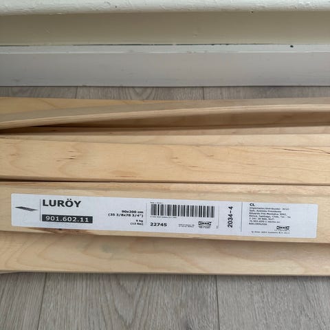 IKEA Lurøy ribbebunn i tre. Ribbebunnen består av buede trespiler festet til bånd, og er beregnet til bruk i seng som støtte for madrass. Egnet for standard sengemål som passer denne modellen. Laget i lyst treverk med fleksible lameller som gir fjæring under madrassen.