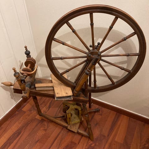 Rokk i tre. Klassisk, manuell modell med stort hjul og rokkehode med spole og snelle. Egnet til spinning av garn og ull, eller som dekorativt møbel/innredningsdetalj. Detaljer som dreide stolper og naturlig treverk med synlige kvister. Leveres som vist på bildene. Et barn har tegnet noen røde streker på en av flatene, dette kan pusses vekk med sandpapir. Rokken virker som den skal.
