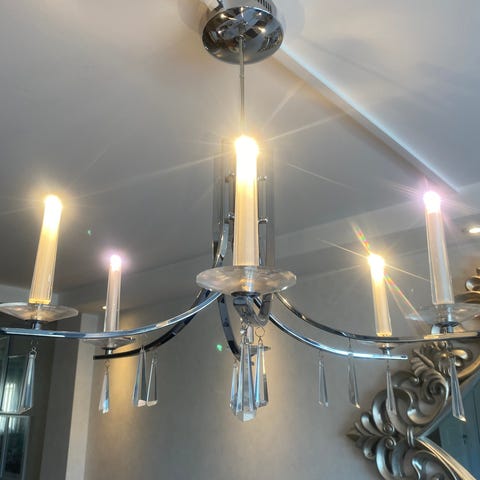 Pent brukt og stilren lysekrone selges for 1000 kr. Lampen har et moderne og elegant design i krom/metall med seks armer og “stearinlys”-formede lyskilder. Dekorativ krystallpendel i midten gir et eksklusivt preg når lyset er på.