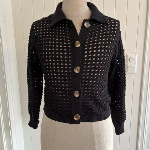 H&M cardigan for dame i størrelse XS. Cardiganen er svart og laget av bomull 62 %.Modellen har ribbestrikket struktur og knepping foran. Passer til hverdagsbruk eller som et ekstra lag over topp eller kjole.