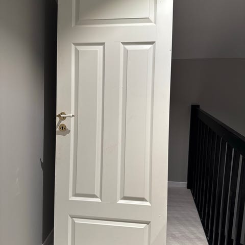4 stk dører med karm. 3 stk med karm uten bunnstokk er ca 68.5 cm bred og ca 208.5 cm høy. 1 stk med karm uten bunnstokk er ca 79 cm bred og ca 208.5 ca høy. 599 Tot for alle 4