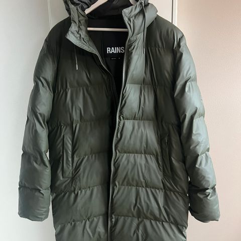 Rains ytterjakke for dame i størrelse XS. Jakken er grønn og laget i polyester. Modellen har vattert utførelse med hette og glidelås foran. Har glidelås på sider også. Egnet som yttertøy i kjøligere vær og regn.
