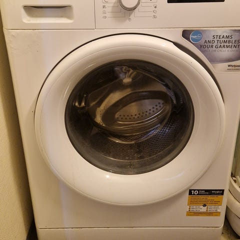 AEG frontmatet vaskemaskin i hvitt. Maskinen har frontåpning med rund dør og trommel i rustfritt stål. Betjeningspanelet består av dreiebryter for programvalg og display med knapper for innstillinger. Egner seg for vanlig klesvask i husholdning og kan plasseres frittstående der det er tilgang til vann og avløp.