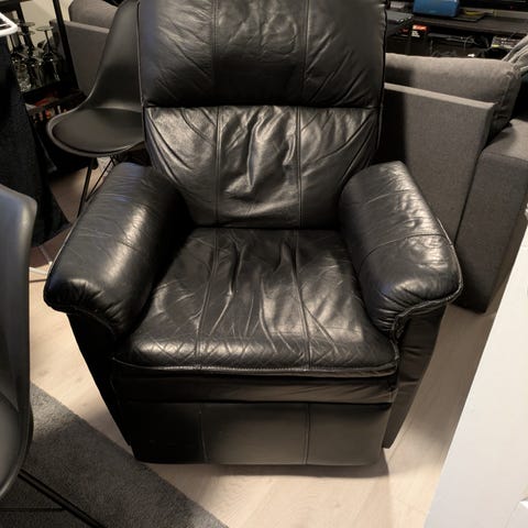 Jysk lenestol med fotskammel i grått tekstiltrekk. Stolen har høy rygg med integrert nakke- og ryggstøtte, polstrede armlener og sete med fast polstring. Fotskammelen har matchende trekk og polstring. Begge deler står på svarte dreide metallben med kryssfot.