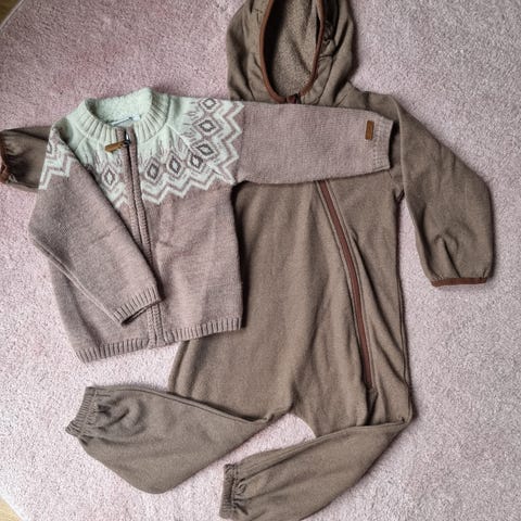 Nydelig ullsett fra Name it str 98/104 i 100% merino ull. Godt brukt av ei jente. Noen løse tråder som kan fikses, ellers ingen hull eller permanente flekker. Mye bruk igjen. Nypris 898kr!