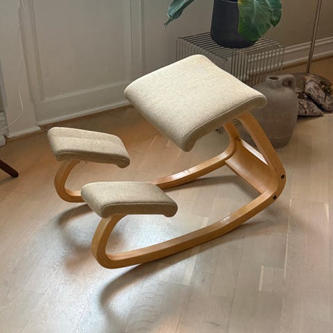 Varier Variable Monochrome knestol i lys blå farge selges. Stolen er nesten ikke brukt i det hele tatt og fremstår så god som ny.