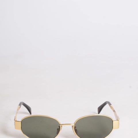 Solbriller for dame med rund fasong. Brillene har rød innfatning rundt glassene og tynne, mørke stenger. Mørke glass gir skjerming mot sollys. Passer som tilbehør til hverdagsbruk og fritid. Størrelse og materiale er ikke oppgitt
