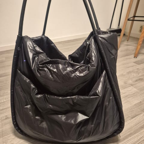 Rommelig veske i dun fra Holzweiler. Liten lomme med glidelås på innside samt inndeling i veskens hovedrom med lomme. Lukkes med glidelås.