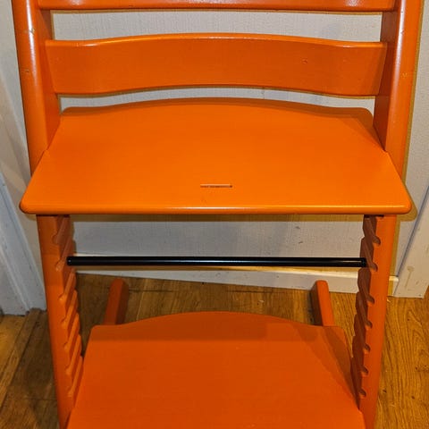 Stokke høy barnestol i tre. Stolen har justerbart sete og fotbrett som kan tilpasses barnets høyde.
