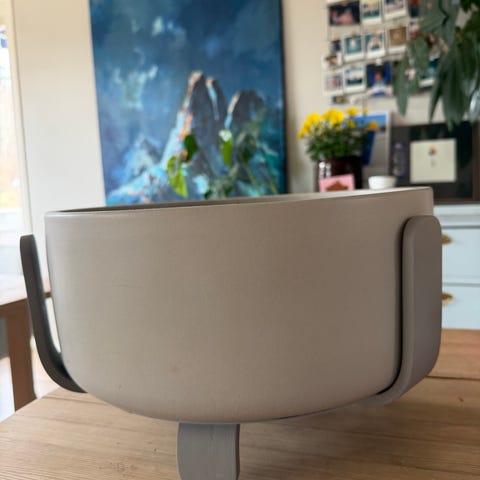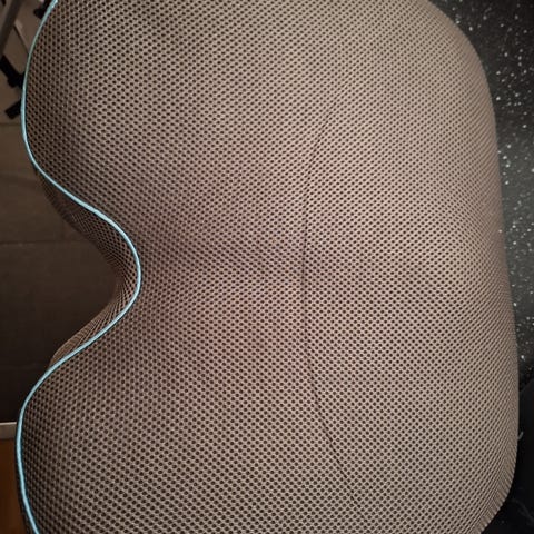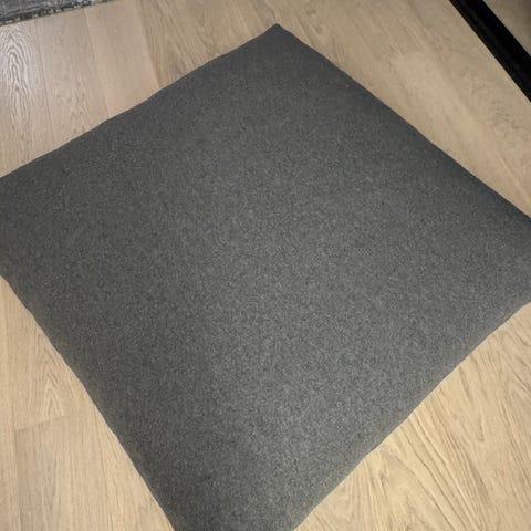 Bolia pute i ullstoff. Den kan reguleres, og har lodd i ene enden slik at den holdes godt på plass over stolen. Håndlaget I Danmark.