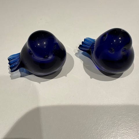 Fuglefigurer pyntegjenstander i keramikk, i ulike farger. Bildene viser tre små fugler i lys oransje med mørk topp, samt én fugl i grå, svart og rød. Figurene har åpning i bunnen, og undersiden viser spor etter bruk eller produksjon. Egner seg som dekorative gjenstander i hylle, vinduskarm eller lignende. Selges samlet eller enkeltvis etter avtale med selger.