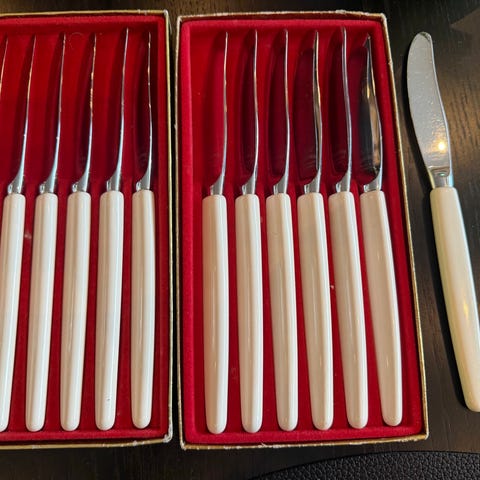 Klassisk norsk knivsett med hvite skaft, trolig fra 1950-tallet.