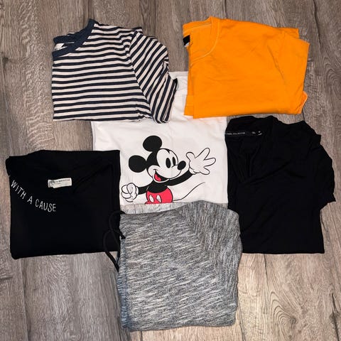 Zara T-skjorte for dame i størrelse S. T-skjorten er i blåtoner og laget av bomull. Den har kort erm og rund hals. Stoffet er mykt og egner seg til hverdagsbruk. Passer til bruk alene eller under genser eller jakke. Selger samlet eller separat.