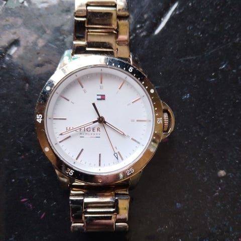 Skiven er lys med tydelige timemarkeringer og logo ved klokken 12. Urkassen har gravert Tommy Hilfiger-navn rundt bezelen.