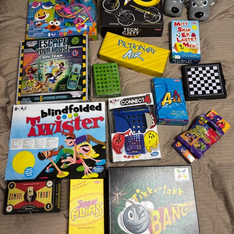 Kongen Befaler, Catan, Spøkelsesspillet, Junior Scrabble, Millionær – Jorda rundt, Gruble og Let’s Raffle It