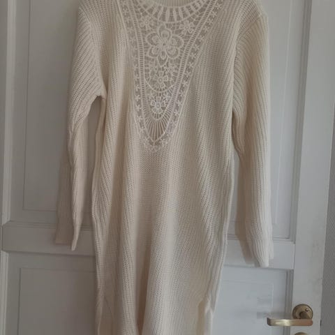 Lang hjemmestrikket kjole i mini alpakka Sandnes garn i størrelse L/XL. Sydde detaljer på bærestykke og nederst på ermene med glitter garn.