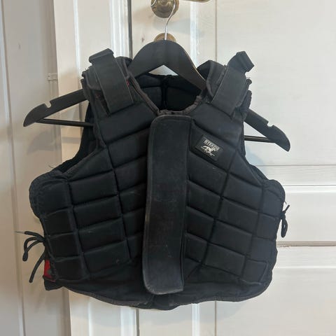 Aequus ridevest i svart farge. Yttermateriale i 100 % nylon, fôr i 80 % nylon og 20 % lycra. Vest med polstrede paneler foran og bak for støtdemping. Justerbare skulderstropper og lukking i livet for tilpasning. Egnet som beskyttelsesvest ved ridning og annen hestesport. Kan vaskes på 30 grader ifølge vaskeanvisning på innsiden av vesten.