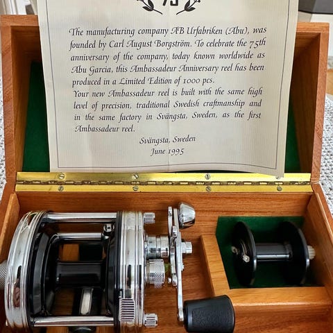 Eldre Ambassadeur Gullsnelle ifl serienummer 960015 03. Ubrukt, meget pen komplett i original treeske. Kan brukes men er først og fremst et utsøkt samleobjekt. Snellen er håndlaget i Svangstad Sverige og har detaljer belagt med ekte gull.