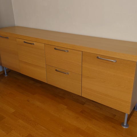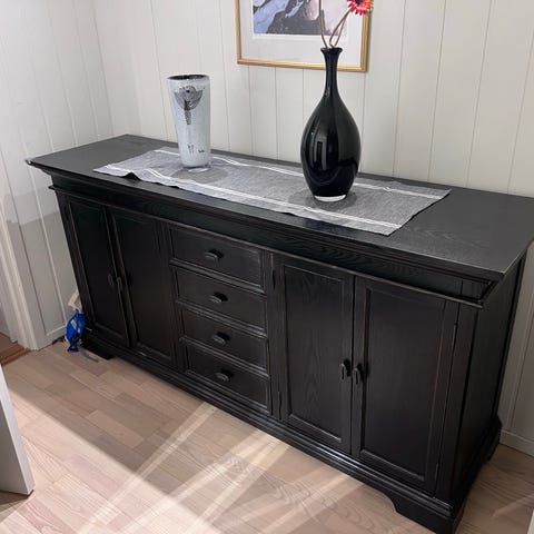 Skjenken er i topp stand! Den er tredelt, to av delene med vanlige skyvedører, og midterste med skyvedører av glass med trerammer. De står hver for seg og kan deles opp og omrokkeres etter ønske. Det selges allikevel samlet.