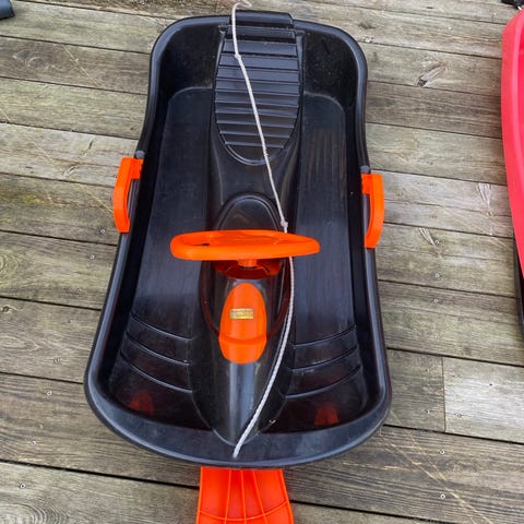 Tiga akebrett i grønn plast. Akebrettet har bøtteformet sete med ryggstøtte og sitteflate i kontrastfarge. Det er utstyrt med snor foran for trekking og styring. Undersiden har flere glideskinner for bedre stabilitet på snø. Egnet som akebrett for barn på snødekte underlag.