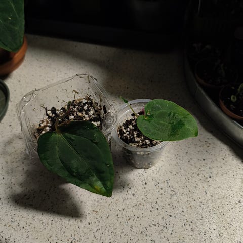 Selger denne potten med 3 små philodendron Hastatum, også kalt Philodendron silver sword på grunn av sølvfargen på bladene.