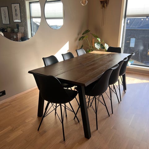 Jotex spisestuestol i svart plast med ben i lyst tre. Stolen har formstøpt sete og rygg i plast, samt metallstag mellom stolbena for ekstra stabilitet. Passer som spisebordsstol eller ekstra sitteplass i stue, kjøkken eller andre oppholdsrom.