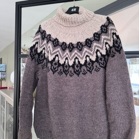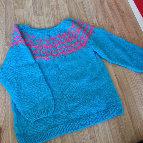 Hjemmestrikket genser i muntre farger. Varm i 100 prosent ullgenser til påske og vinterferien.