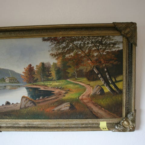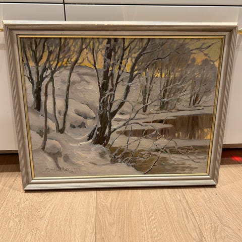 Landskapsmaleri av ukjent kunstner ( signert med L.A i nedre hjørnet)som viser fjell, innsjø og skog i klare farger. Bildet er signert nede i høyre hjørne. Maleriet er innrammet i en dekorativ ramme med utskårne hjørneornamenter og lys, patinert overflate. Motiv og farger gir et klassisk naturpreg som passer i stue, gang eller hytte. Egnet for oppheng på vegg som veggdekorasjon.