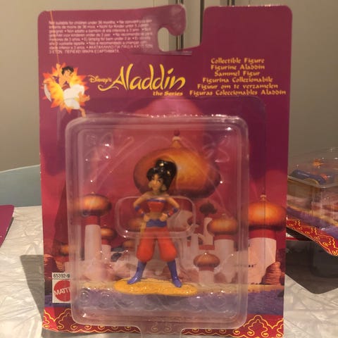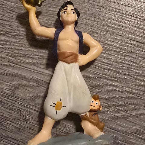 Disney Aladdin Genie figur leke i blå plast. Figuren forestiller ånden Genie fra Aladdin, med lampe i hånden. Produsert i plast med støpte detaljer, inkludert rød belte og gullfargede mansjetter. Egner seg som leke eller samlefigur. På undersiden er den merket med Disney og produksjonsinformasjon.