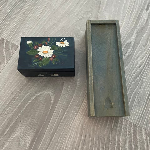Eske med stoffrester i ulike størrelser, farger og mønstre. Inneholder flere typer tekstiler egnet til for eksempel sømprosjekter, lappeteknikk eller små håndarbeidsprosjekter.