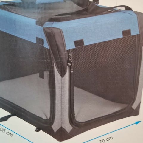 Sammenleggbart transportbur til kjæledyr i grå tekstil med svarte detaljer. Buret har nettingpaneler på flere sider for lufting og innsyn, samt glidelåsåpning i front og topp. Et lite hull i netting men fungerer fint. Egnet for mindre dyr som hund eller katt, for bruk i bil, på reise eller som midlertidig hvileplass i hjemmet. Vaskbart trekk i bunnmatten. 50 cm langt og 35 høyt.