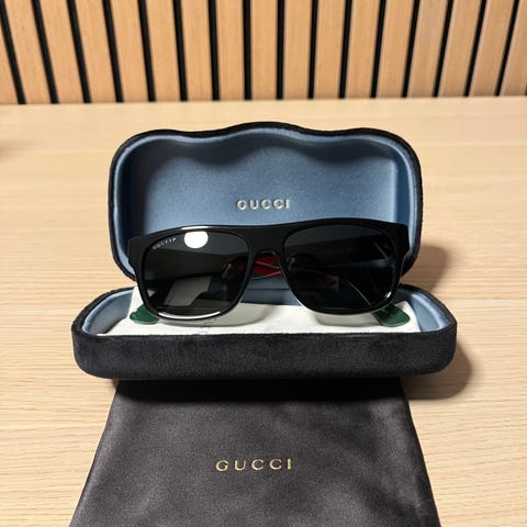 Gucci solbriller for dame i svart farge. Modellen har ovale glass og svarte innfatninger med dekorativ G-logo med steiner på stengene. Solbrillene leveres med etui og pusseskinn, som vist på bildene. De er godt brukt, men fortsatt mange år med bruk igjen i seg.