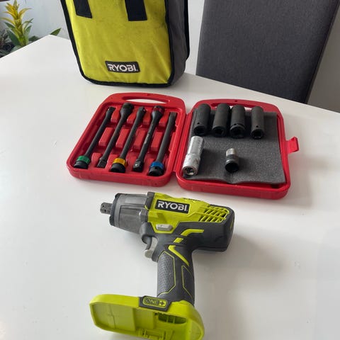 Ryobi 18V muttertrekker med 2,0Ah batteri, lader og transportbag.