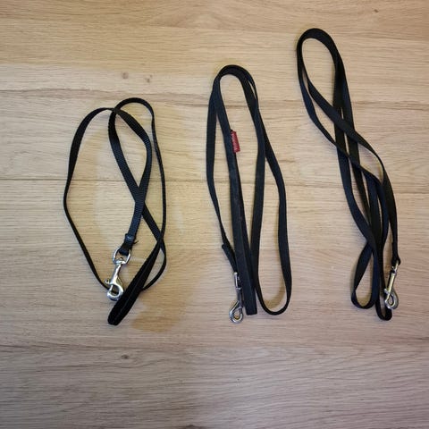 Selger to kobbler med kroker i begge ender. Det fra Rukka er ca. 280cm lang og 6mm bredt og de sorte er ca. 200cm lange og 1cm brede. Har ringer du kan feste krokene i på båndene. Kan også brukes med f.eks. trekkbelte.