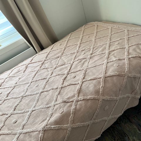 IKEA sengeteppe i rosa farge. Teppe med quiltet mønster, laget av 100 % polyester. Passer til bruk over seng som dekorativt og beskyttende lag. Kan vaskes i maskin etter vaskeanvisningen på merkelappen. Egnet til soverom som ønsker et ensfarget, mykt sengeteppe i lys rosatoner.
