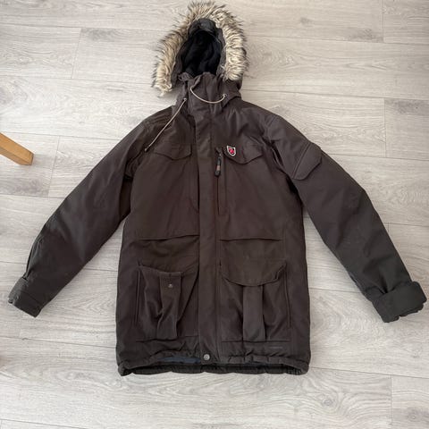 Brukt Fjällräven Nuuk Parka vinterjakke for dame og herre i størrelse XL. Jakken er brun og laget i polyester. Modellen er en lengre parka med hette og syntetisk pelskant. Den har frontglidelås med klaff, flere utvendige lommer med klaff samt innerlommer. Jakken er designet som vinterjakke med god dekning og isolasjon rundt overkropp og lår. Passer til hverdagsbruk og utendørsaktiviteter i kaldt vær.