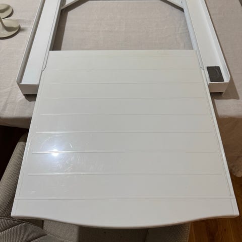 Uttrekkbar hylle for plassering mellom vaskemaskin og tørketrommel. Hyllen er i hvit plast/metall og kan trekkes ut for å gi en ekstra avlastningsflate, for eksempel til kleskurv eller sammenlegging av tøy. Egnet for standard vaskemaskin- og tørketrommelstørrelser der maskinene står stablet. Monteres mellom maskinene for å gi bedre utnyttelse av plassen i vaskerom eller bad.