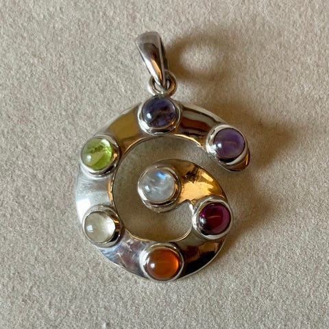 Nydelig Chakra i smykke i 925 S med halvedelstener og en stjerne selges. Stempelet er inne i søken (festet). Det er 3,3 cm i diameter. Selges for kr 650,-