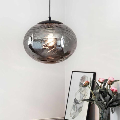 Stilren taklampe / pendellampe i sotet glass med sølvdetaljer. Helt ny og uåpnet.
