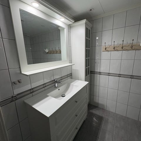 Ved siden av servantskapet står et 167 cm høyt, 32 cm bredt skap med dør.
