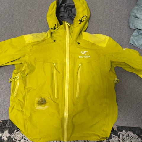 Arcteryx beta ar jakke. Størrelse medium. Litt skitten og en del brukt. Men alle sømmer og liming er i orden. Var nylig på service hos arcteryx og de sveisa sammen alle limepunkter med nye materialer så den er helt fresh innvendig.